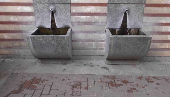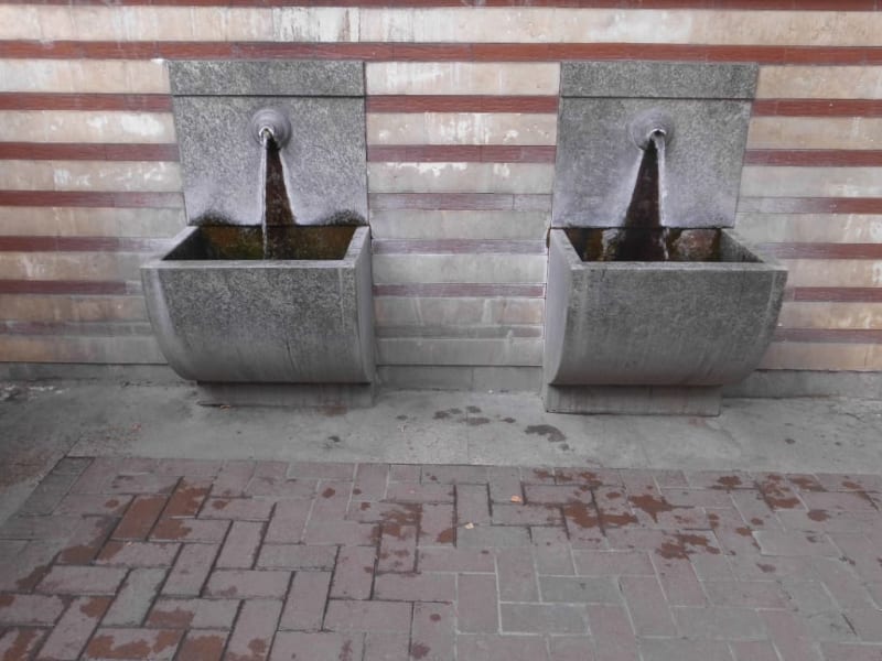 Gleich beim ehemaligen Zentralbad und jetzt dem History Museum befinden sich auch die neuen Wasserentnahmestellen von der Thermalquelle. Vorsichtig probieren : das Mineralwasser ist heiß. Von hier schaut man auch auf die Moschee und die Markthalle. Gleich nebenan ist auch Lidl.