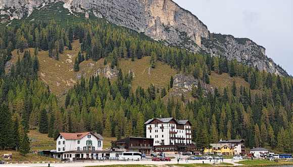Nach der Umrundung der Drei Zinnen fuhren wir zum Lago di Misurina und stoppten an der Gastronomie um uns dort direkt an der kleinen Straße neben dem See hinzusetzen und auszuruhen. Dieses Restaurant wird wohl auch viel von Bikern angefahren, die sich ebenfalls dort aufhielten. Essen, Getränke und Freundlichkeit waren klasse, Preisleistungsverhältniss war absolut prima und der Ausblick seht schön.