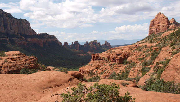 Die Mitten Ridge und die Cowpies sind ein kleiner Teilbereich der herrlichen Red Rocks rund um Sedona und befinden sich gleich östlich der Stadt. Sie sind über die Schnebly Hill Road zu erreichen (Abzweigung nahe der "Künstlerstadt" Tlaquepaque Richtung Nordosten). Leider ist nur der untere Teil der Straße asphaltiert, der Rest ist eine Schotterpiste. Mit genügend Bodenfreiheit kann man den Parkplatz beim Beginn des Weges (beschildert) erreichen, wir haben es aber vorgezogen unseren Mietwagen am Ende der ausgebauten Strecke stehen zu lassen und den Rest der Schnebly Road raufzuwandern (hier gibt es Toiletten, achtung: Park- bzw. Eintrittsgebühr für die Red Rocks, ca 4 Euro pro Fahrzeug, Automat). Man muß für die zusätzliche Strecke zu Fuß etwa eine knappe Stunde pro Richtung rechnen. Die Straße liegt zwar landschaftlich recht schön, die ständig vorbeifahrenden Touren Jeeps haben aber ein wenig gestört. Parallel dazu führt ein Wanderweg, aber auf der Straße ist man schneller. Trotzdem lohnt sich die Wanderung. Der eigentliche Wanderweg führt dann zuerst zu den Cowpies, einem kleinen Felsplateau mitten im Tal, das durch seine Form von Weitem an Kuhfladen erinnert. Das Plateau gilt als einer der Vortex Punkte rund um Sedona, und soll spirituelle Kraftfelder besitzen (Sedona ist ja eine Art Treffpunkt für Esotheriker). Steinkreise markieren diese Kraftfelder. Auch wenn man nicht daran glaubt, die Aussicht ist recht schön. Gleich über den Cowpies erhebt sich die Mitten Ridge, eine Kette roter Felsen. Über einen felsigen Hang gelangt man weiter auf einen Sattel (zwar kein markierter Weg, aber für etwas geübte Wanderer problemlos zu erreichen). Der Blick von hier oben ist super schön und lohnt meiner Meinung nach die Mühe. Man kann den gleichen Weg wieder zurückgehen. Wenn man trittsicher und schwindelfrei ist, kann man auch (etwa auf Höhe des Sattels am Fuß der Felsen entlang) Richtung Sedona weitergehen (weitere tolle Ausblicke). Etwas weiter westlich beim nächsten Sattel (ca. 45 Minuten) trifft man dann wieder auf einen Weg der zuerst nördlich der Felsen vorbei und dann beim dritten Sattel retour runter zur Schnebly Hill Road führt. Diese Variante empfehle ich aber nur wirklich geübten Wanderern. Egal für welche Variante man sich entscheidet, die Umgebung und Ausblicke sind toll.
