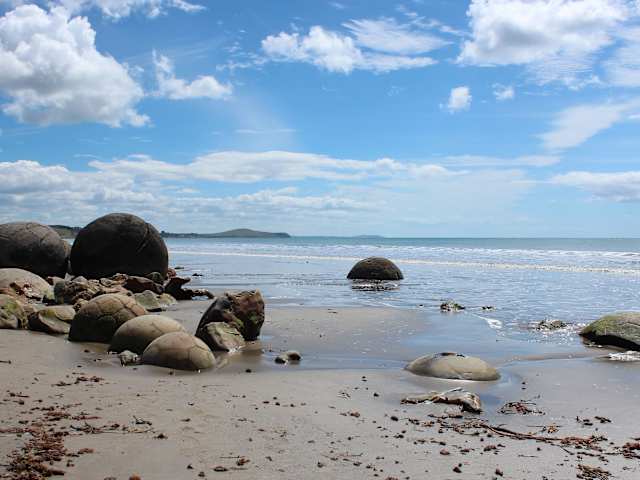 Auf der Fahrt von Dunedin nach Oamaru kommt man am kleinen Ort Moaraki vorbei. An der Straße weist ein Hinweisschild den Weg zu einer einmaligen Naturschönheit, den Moaraki Boulders. Das sind tonnenschwere, halbkugelförmige Felsblöcke, die in großer Zahl am Strand liegen oder vom Pazifik umspült werden, je nach Gezeitenstand. Über die Entstehung gibt es viele Erklärungen. Tatsache ist wohl, dass sich vor langer Zeit um einen harten Gesteinskern weicheres Kalkmaterial gebildet hat, das jetzt Wind und Wasser ausgesetzt ist. Beim Rundgang habe ich nicht darüber nachgedacht, sondern nur gestaunt über diese bizarren Kugeln, die aus einer anderen Welt zu stammen scheinen. Fazit: Ein Besuch ist absolut empfehlenswert. Bei diesen tollen Fotomotiven ist die Kamera ein Muss.