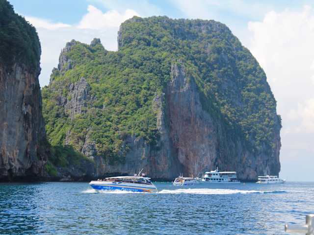 auf dem Weg zu den Phi Phi Inseln machten wir als erstes Stopp auf der Affen-Insel. Man bekommt außer dem kleinen Strand nicht viel zu sehen, das witzige sind die dort lebenden Affen, sie sind handzahm und sehr frech. Sie klauen alles was nicht niet und nagelfest ist, einem Gast haben sie sogar die Cola Flasche entwendet, meine Brille wäre auch fast weg gewesen. Extra auf diese Insel fahren lohnt nicht, aber als Stopp ist sie OK.