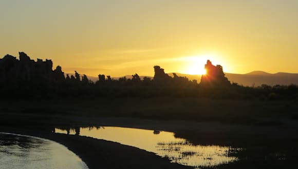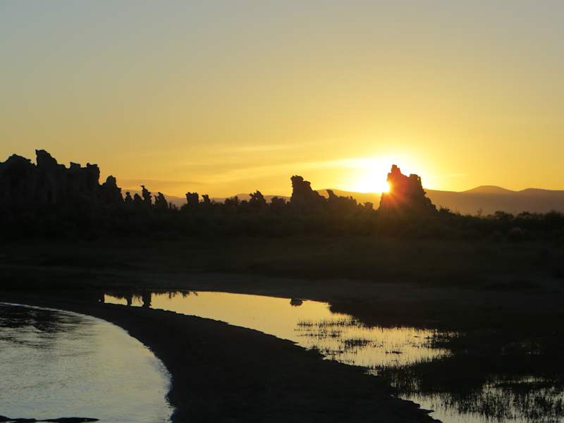Der "Mono Lake" liegt in einer Höhe von knapp 2.000 Metern östlich der Sierra Nevada in der Nähe von Lee Vining. Dabei handelt es sich um einen sowohl besonders alkalischen als auch besonders salzhaltigen abflusslosen Natronsee, dessen Fläche je nach Wasserstand zwischen 150 und 190 Quadratkilometer schwankt. Dieser Zustand entstand durch die Nutzung des Gebiets zur Trinkwasserversorgung von Los Angeles. Zugleich wurden im See und am Ufer zahlreiche unter Wasser entstandene weißgraue Kalktuff-Gebilde in bizarren Formen sichtbar. Diese Felsnadeln bilden sich, wenn kalziumhaltiges Frischwasser aus unterirdischen Quellen nach oben steigt und sich mit dem stark alkalischen, karbonathaltigen Wasser vermischt. Wegen der herrschenden Umweltbedingungen müssen die hier beheimateten Tiere und Pflanzen sowohl an den hohen pH-Wert angepasst sein als auch den Salzgehalt ertragen können. Da der Mono Lake deutlich salziger als die Ozeane ist, leben keine Fische darin, sondern nur kleine Salinenkrebse. Homepage: http://www.monolake.org/visit/