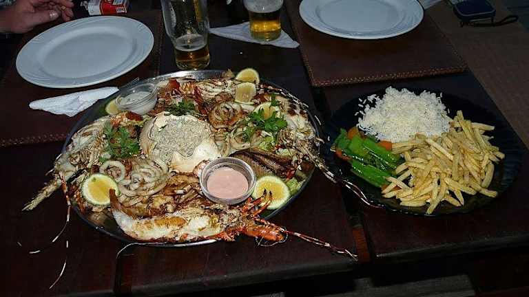 Ein Besuch im The Moorings lohnt sich in jeder Hinsicht. Zum einen wegen des hervorragenden Essens, zum anderen wegen der herrlichen Lage und dem tollen Sonnenuntergang. Wir hatten als Vorspeise "smoked sailfisch" - geräucherter Segelfisch und eine Grill-Fischplatte für 2 Personen. Auf dieser waren pro Person ein ganzer Lobster, fünf Prawns, zwei Scheiben gegrillter Segelfisch, Tintenfischringe und für beide ein Krabbenpanzer, gefüllt mit ausgelöstem Krabbenfleisch. Dazu gab es eine Beilagenplatte mit Pommes Frites, Reis und Gemüse. Das Ganze kostete einschließlich Getränken und Taxi 3000 KSH pro Person.