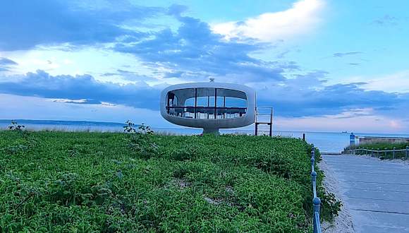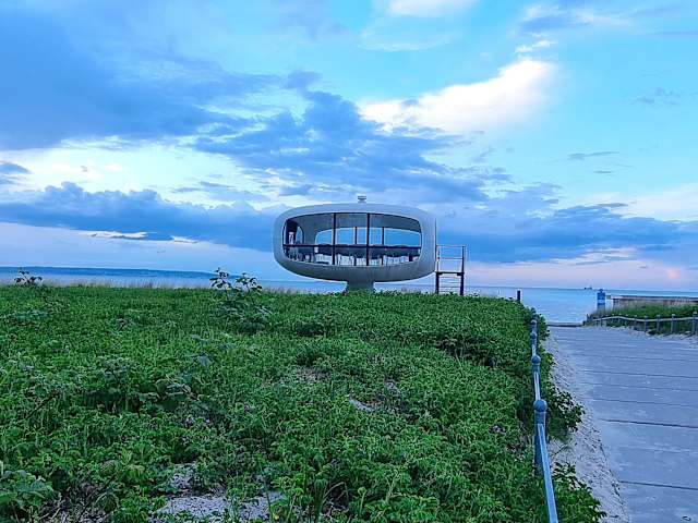 Der Müther-Turm-eine Sehenswürdigkeit am Binzer Strand.Erbaut als Rettungsturm zu DDR Zeiten durch Ulrich Müther.Der Pionier des Hyparschalenkunstruktion stammt von der Insel Rügen.Heute ist der Turm ein Standesamt.