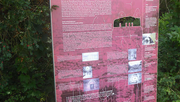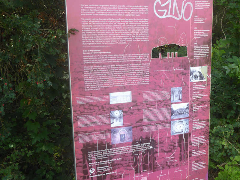 In unmittelbarer Nähe vom Schloss Cecilienhof befindet sich die Grotte am Jungfernsee. Der Jungfernsee ist ein Becken- und Rinnensee und wird von der Havel durchflossen. Der Jungfernsee erstreckt sich über 3,52 km von Nordwest nach Südost und liegt damit quer zur natürlichen Fließrichtung der Havel in der Havelseenkette. Vor der Grotte am Jungfernsee befindet sich eine Hinweistafel mit interessanter Beschreibung der Muschelgrotte. So wurde die Grotte einst vom preußischen König Friedrich Wilhelm II (reg.1786 -1797) als versteckter Rückzugsort für Teestunden und zum Speisen erbaut. Schon während der Regierungszeit seines Nachfolgers Friedrich Wilhelm III (reg. 1797 – 1840) blieb die Grotte ungenutzt und geriet schnell in Vergessenheit. Unzählige Reparaturarbeiten aus dem 19.Jahrhundert zeigen aber, dass dennoch für den notwendigsten baulichen Unterhalt Sorge getragen wurde. Von 1963 – 1989 lag die Muschelgrotte im Sperrgebiet der Grenzbefestigung und war dadurch dem endgültigen Verfall preisgegeben. Erst seit der Grenzöffnung konnte durch die Erneuerung der Dachkonstruktion und einer Notsicherung von Resten der einstigen Grottierung und Ausmalung der unausweichliche Untergang gestoppt werden. Die Muschelgrotte am Jungfernsee ist angeblich eine der letzten erhaltenen, eigenständigen Grottenarchitekturen. Leider ist das Innere der Muschelgrotte einer Mischung aus Ruine und Baustelle, doch die Reste der einst aufwendigen Dekorationen lassen die frühere Schönheit noch erahnen.