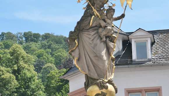 Auf dem Kornmarkt von Heidelberg befindet sich der sogenannte Muttergottesbrunnen. Auf der viereckigen Säule, aus der auf jeder Seite ein Wasserrohr ragt, steht eine sehr schöne Darstellung der Gottesmutter Maria mit ihrem Sohn Jesus, den sie auf dem Arm trägt.