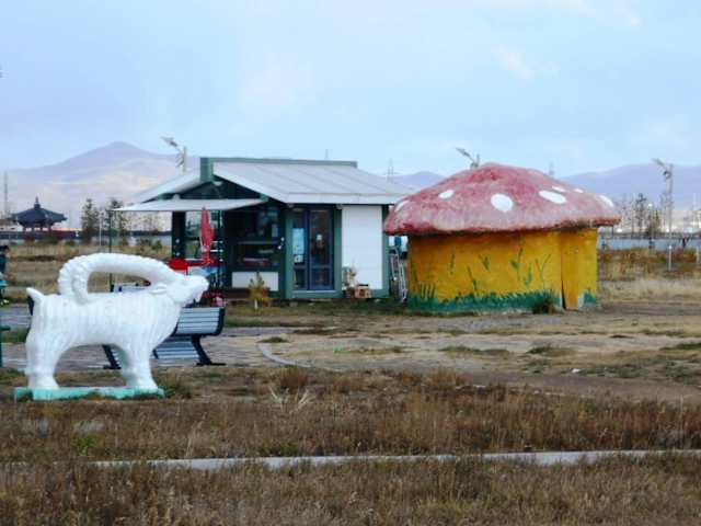 Der Nationalpark am südlichen Stadtrand von Ulaanbaatar ist kein Naturschutzgebiet, sondern eine Parkanlage die als Freizeit- und Erholungsgebiet neben den neu entstandenen Wohnvierteln geschaffen wurde. Es wurden auch einige Skulpturen von mongolischen Künstlern aufgestellt – alles in allem wirkte der Park jedoch noch ziemlich unfertig, als wir in der letzten Septemberwoche dort waren. Auch ging die Sommersaison schon deutlich ihrem Ende entgegen, die frisch gepflanzten jungen Bäume verloren ihre Blätter, und im Rasen war kein grünes Fleckchen mehr zu finden – der Herbst hält in der Mongolei früh Einzug. Attraktion des Parks sind aber auch in der derzeitigen Phase eindeutig schon die beiden Fahrrad-Rundwege – ein größerer und ein kleinerer. Ein Fahrradverleih hat auch seinen Betrieb aufgenommen, denn eigene Fahrräder kommen bei den jüngeren Einwohnern von Ulaanbaatar erst langsam in Mode. Und hier kann man wesentlich ungefährdeter Radfahren als auf den von Autos verstopften Straßen von Ulaanbaatar. Kinderkarussels, Hüpfburgen, und batteriebetriebene Kinderautos sind für den Spaß der kleineren Besucher vorhanden. Und einige Imbissstände und Cafés sind auch in Betrieb.