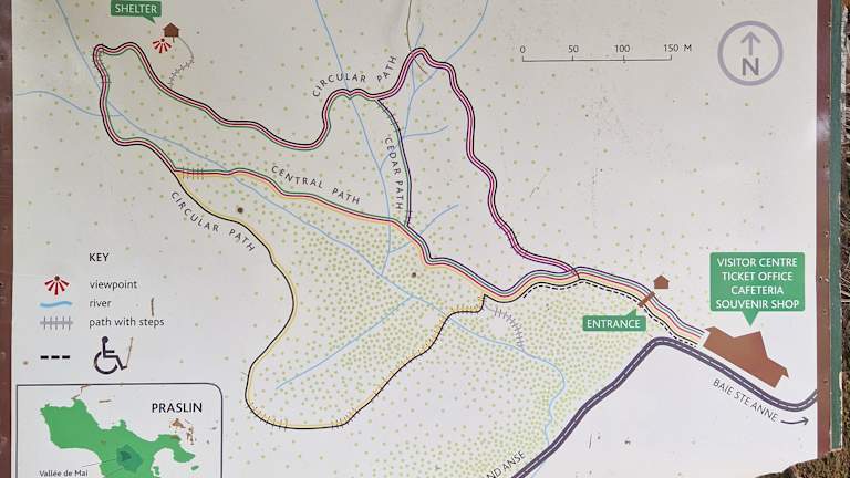 Auch hier heiss, zum Schwitzen top. Früh morgens waren wir da und schon nass geworden. Sehr gute sichere Pfade inmitten toller Natur, hohe Bäume und schöne solide Wege, gut ausgeschildert. Man braucht keine Führung extra zu zahlen, es ist alles gut ausgeschildert. Man kann verschiedene Wege nehmen. Hier sieht man Coco de Mer, endemisch. Im Eingang kann man das auch anfassen, halten, sich fotografieren lassen. Vorsicht, wiegt ca. 20 kg!