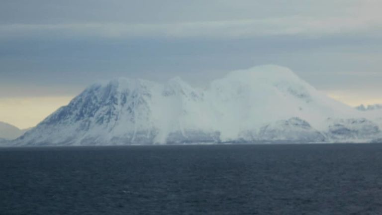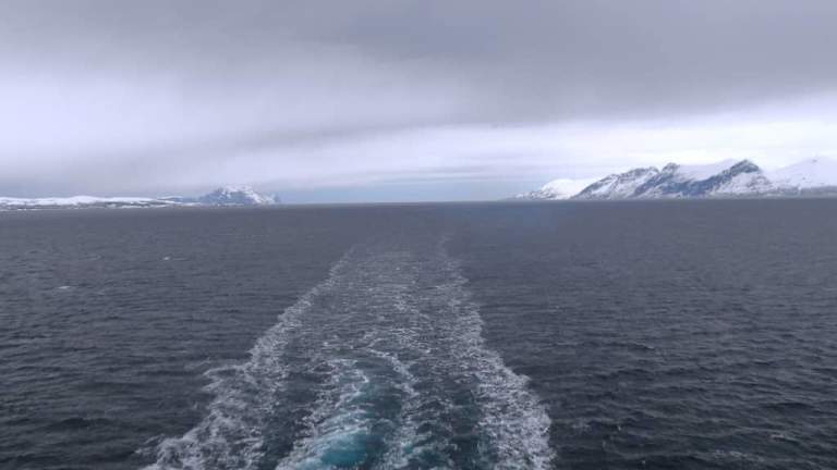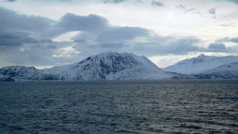 Auf der Kreuzfahrt zum Nordkap war unser erster Stopp innerhalb des Polarkreises der Hafen von Tromsø. Um vom Nordmeer nach Tromsø zu kommen, führte der Weg durch den von schneebedeckten Bergen umgebenen Grindøysund. Wegen des sehr bedeckten Märzwetters war es eine etwas düstere Stimmung, aber die Fjordlandschaft hat auch bei diesem Wetter ihre Reize.