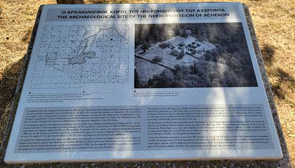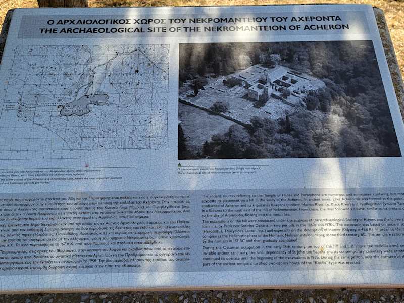 Auf einem Hügel in Mesopótamos, ganz in der Nähe der Mündung des Totenflusses Achéron ins Ionische Meer liegt das einstige Totenorakel der antiken Stadt Ephyra. Das Orakel wurde aufgesucht, um mit den Toten zu kommunizieren und sich bei den Seelen der Verstorbenen Rat zu Problemen oder Antworten auf Zukunftsfragen zu holen. Nach Opfergaben, vielen Zeremonien und einer mehrtägigen Kur mit berauschenden Tränken und Speisen, die dem Ratsuchenden die Sinne und den Verstand vernebelten, inszenierten die Priester mit Hilfe eines Flaschenzugsystems die Auferstehung der Toten und erteilten die erwünschten Ratschläge aus einem unter dem Kultraum liegenden Tonnengewölbe. Der Fragende hatte demnach den Eindruck, die Stimmen kämen direkt aus dem Schattenreich des Hades. Homer ließ hier in der „Odyssee“ seinen Helden Odysseus den toten Hellseher Tiresias aufsuchen um ihn nach seiner Rückkehr nach Ithaka zu befragen. Da er in seinem Epos auch noch detaillierte Ortsangaben zur Orakelstätte lieferte, wurde man bei den Ausgrabungen 1956 auch tatsächlich fündig. Die heutigen Ruinen stammen jedenfalls nicht aus der Zeit Homers, sondern aus dem 3. Jhdt.v. Chr. Der untere Teil des labyrinthartigen Gebäudekomplexes ist bis zu einer Höhe von 3 Metern noch gut erhalten. Den größten Teil der Anlage passiert man auf einem schmalen Korridor, der von zahlreichen Räumen gesäumt ist und zum Herzstück des Totenorakels führt- dem Kultraum, unter dem das, nur über eine schmale Eisentreppe zu erreichende, düstere Gewölbe liegt. Die auffallendste Fassade des Bauwerkes gehört zur Kirche Johannes des Täufers aus dem frühen 18. Jhdt. Sie ist ebenfalls zugänglich, hat jedoch außer ihren schönen Wandmalereien nichts sonderlich Nennenswertes. Der Eintritt für Erwachsene kostet € 2, 00. Broschüren über das Heiligtum kann man vor Ort käuflich erweben. Achten Sie auf bequemes Schuhwerk. Am Eingang wurden wir zur Vorsicht angehalten, da sich auf den warmen Steinen des Geländes gerne Vipern aufhalten sollen. Es gibt keinen Parkplatz vor dem Heiligtum und die Zufahrtsstraße vom Dorf ist für Fahrzeuge gesperrt. Im Ort gibt es ausreichende Parkmöglichkeiten, der Fußweg hinauf zum Hügel dauert nur 10 Minuten.