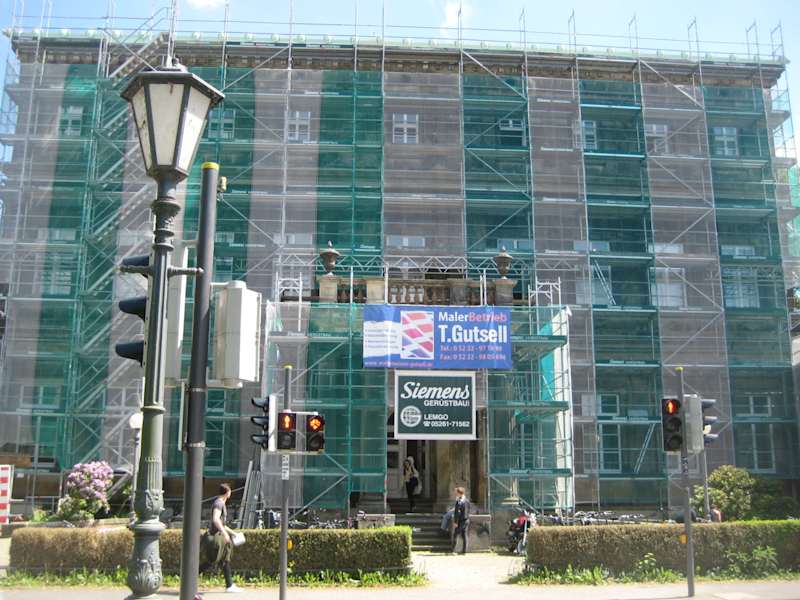 Ich habe mir in diesem Jahr erneut das Neue Palais von außen angeschaut und wollte es mir auch aus der Nähe anschauen. Nun ist aber momentan der mittlere Teil sorgfältig „eingepackt“. Dort wird - zur Straße hin - saniert. Auf einem Schild ist das Wort "Maler"… zu sehen und in einem Artikel im Netz ist zu lesen, dass man sich im Malerbetrieb geehrt fühlt, dort arbeiten zu dürfen. Der linke und rechte Flügel des Palais sind nicht betroffen. Ich habe mich dann auf die Rückseite des Palais begeben und dort hatte ich einen vollen Blick auf das Bauwerk und auf den Delfin-Brunnen, den man sofort nach Betreten des Geländes erblickt. Ich habe mich ein wenig erschrocken: Der Brunnen war grün. Und auch der Rest des Geländes sah etwas vernachlässigt aus. Aber vielleicht / wahrscheinlich wird auch dort dann saniert. Ein Besuch lohnt sich allemal, weil es ja auch den großen Palaisgarten gibt. Zwei Bilder vom Pumpenhaus, das früher die Wasserspiele im Palaisgarten mit Wasser versorgte, liegen hier an. Zur Geschichte des Neuen Palais habe ich in meiner Bewertung von Februar 2023 geschrieben.