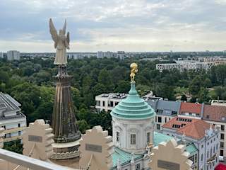 Der imposante Bau der Nikolaikirche ist schon von weitem sichtbar. Natürlich habe ich mir die Kirche auch von innen angeschaut, aber mein Ziel war die Turmbesteigung. Diese kostet 5 € und 223 Stufen führen bis zur Aussichtsplattform, die man dann umrunden kann. Von dort oben hat man einen wunderbaren Ausblick auf ganz Potsdam und Umgebung. Es ist schon anstrengend die Wendeltreppe hochzulaufen, aber man wird dafür mit einer tollen Aussicht belohnt. Man kauft ein Ticket am Automaten, und man muss damit verschiedene Stationen durchlaufen und das Ticket durch Automaten an den Drehkreuzen ziehen. Deswegen sollte man das Ticket immer parat halten. Es ist alles super digitalsiert. Es hat mir super gefallen dort oben. Ich war an einem Mittwochvormittag so gegen 10 Uhr dort, und es waren sehr wenige Besucher dort, und es gab auch keinen Stau im Treppenhaus.