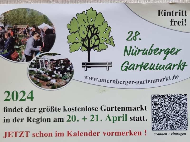 In Nürnberg Ortsbereich Großgründlach findet einmal im Jahr der großartige Gartenmarkt statt, Eintritt frei und auf seiner sehr großen Fläche zeigen und Präsentieren die Händler ihre Produkte, gerade im Frühjahr hat man Hunger auf neues Grün im Garten, Produkte für das Haus sowie Gartenmöbel und Gartenaccessoires, sehr gute Beratung wird geboten, kleine Imbissstände runde das Event ab. . Internet: www. nuernberger-gartenmarkt. de