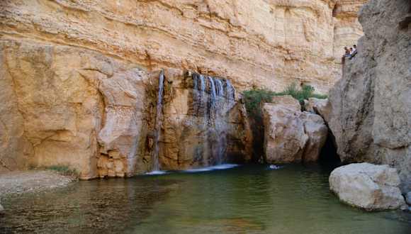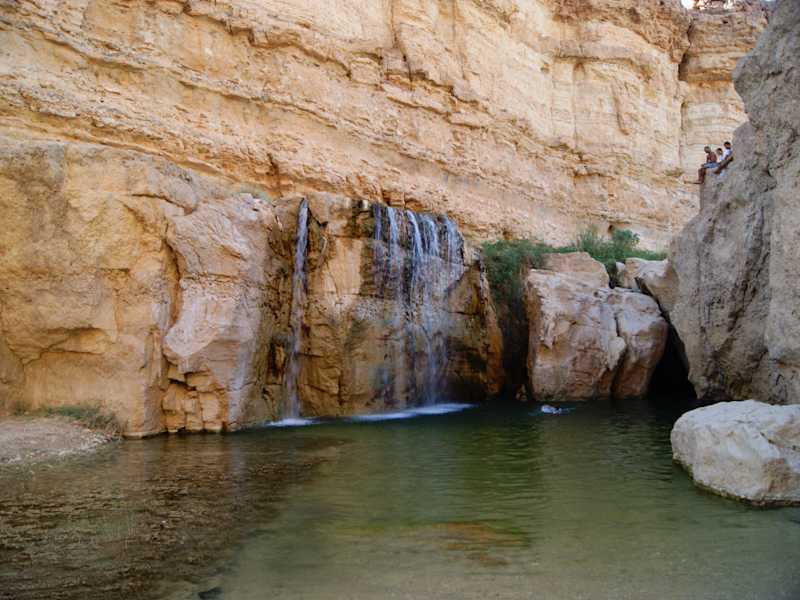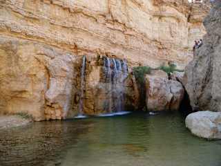 Wir sind mit der Gruppe zunächst in den Ort, die große Oase, gefahren und konnten den alten Teil der Oase bewundern. Von hier aus sind es nur noch ca. 3 km bis zur algerischen Grenze. Der Blick von der Terasse eines Hotels auf das ausgetrocknete Wadi und die alte Oase, die Überreste sind noch gut erkennbar, sind einfach toll. Anschließend fährt man an den Rand der Stadt (Oase) um einen Wasserfall mit kleinem Fluss, hervor springend aus dem Fels, zu beobachten. Man kann in Ruhe dort umher laufen. Die Souvenierläden sind nur auf dem Parkplatz zu beobachten, die Natur bleibt Gott sei Dank unberührt. Auf jeden Fall sollte man beides, die Stadt (alte Oase) und den Wasserfall am Rande besuchen.