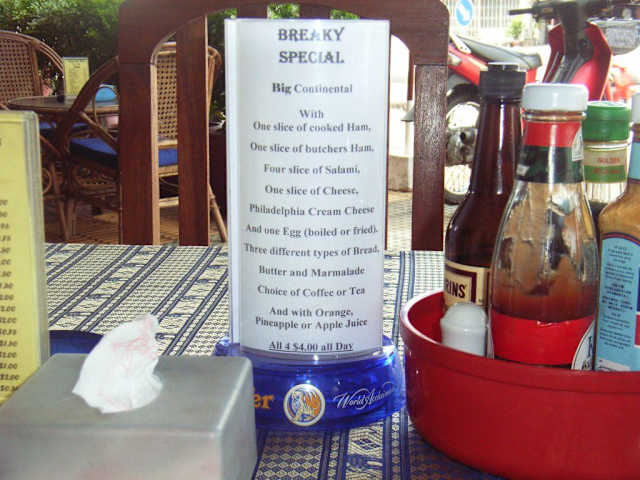 Das Oasis Pizza Restaurant liegt auf der rechten Seite ca. 200 > 300 m von der Kreuzung entfernt . An der Ecke befindet sich eine Tankstelle , wo es dann zum großen Markt geht . Ab 7 > 10 Uhr Früh , gibt es nicht nur Pizza im Angebot lt. Speisekarte , sondern auch ein für 3 Dollar amerikanisches Frühstück . Entweder stellt man sich alles selbst zusammen von der Karte oder sieht sich das für 4 Dollar ( amerik. spezial Frühstück ) das Hinweisschild an am Tisch .