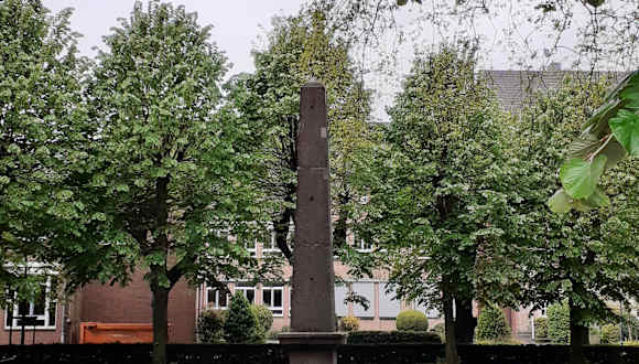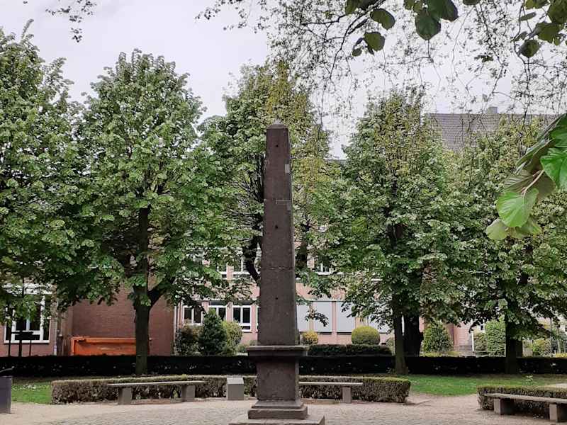 Der Obelisk aus Trachyt, der auf dem westlichen Domplatz steht, ist ein Grabmal für den 1799 verstorbenen Stiftsherren Cornelis de Pauw. Während eines Besuchs im Jahr 1811, als die Stadt von den Franzosen beherrscht wurde, missfiel Kaiser Napoleon das schlichte Grab des Stiftsherren im Kreuzgang des Stiftes und er ordnete an, ihn auf den damaligen Friedhof westlich des Doms umzubetten und mit einem Obelisken zu ehren. Der Obelisk trägt die französische Inschrift »simple monument« - einfaches Denkmal.