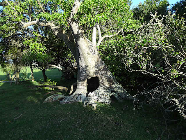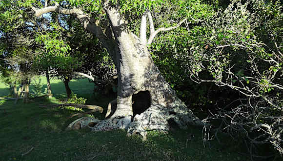 Wenn man von Rocha aus Richtung Norden nach Castillos fährt, kommt man zu dieser botanischen Besonderheit, dem Ombue-Wald. Zum Wald selbst gelangten wir mit dem zuständigen Führer "Octavio", der uns vom Treffpunkt aus mit dem Traktor zu einem Sumpfgebiet bracht, von wo aus wir zu Fuß weitergingen. Zum Teil über Holzstege und Hängebrücken durch ein Sumpfgebiet in dem z. Bsp. das Carpincho (Wasserschwein) zuhause ist, gelangt man schließlich zu dem kleinen Ombue Wald, wo man sich vorkommt wie im Märchenwald. Die Ombues mit den gigantischen, imposanten Stämmen sind eigentlich gar keine Bäume, sondern gehören botanisch gesehen zu den Riesengräsern. Die Fahrt mit Traktor und Anhänger kostete nur wenig und man erfuhr von Octavio alles Wissenswerte zu den Ombues.