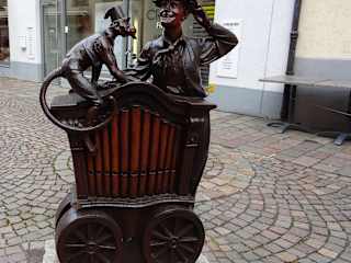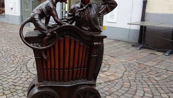 Waldkirch ist bekannt für Dreh- und Jahrmarktsorgeln und auch andere mechanische Musikinstrumente gehören dazu. Neben einer Schaustellerorgel bei der Tourist-Information (spielt freitags um 12 Uhr) passt da eine Darstellung eines Drehorgelspielers mit einem kleinen Äffchen des Künstlers Klaus-Dieter Kienzler aus dem Jahr 2002. Schönes Fotomotiv in der Engelstraße.