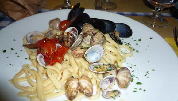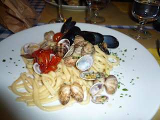 Kleine Osteria in einer Seitenstraße der Via Toledo. Sehr gutes und günstiges Essen. Tolle Vorspeisen (vom Chef des Hauses) empfohlen. Acht Teller mit div. Vorspeisen Euro 8,--) Nudeln oder Rissotto mit Meeresfrüchte und auch der Schwertfisch ein Traum (siehe auch Bilder). Auch der Vino della casa für 3,-- Euro die FLASCHE schmeckt ausgezeichnet. Bitte unbedingt um 19.00 Uhr kommen, oder vorbestellen. Montags ist Ruhetag.