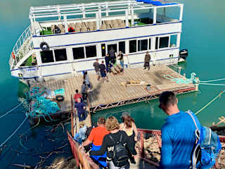 TAGESAUSFLUG Wir wurden pünklich vom Hotel abgeholt. Bootsfahrt auf Green Canyon war nicht besonders,ging ca 2 Std.Boot war sehr voll,man fühlte sich sehr unwohl,richtig eng.Getränke auf dem Boot zu teuer.Natur schön und tolle Farbe des Wassers.Auf der Rückfahrt gab es eine Badepause von 30 Minuten.Dann hieß es zum typisch türkischen Mittagessen.Wir sahsen an einer langen Tafel und bekamen Vorspeise,Hauptspeise und Nachtisch.An unserer Tafel wurde niemand satt,es war einfach zu wenig Essen.Wir hatten uns vom Essen mehr versprochen.Getränke musste man extra bezahlen.(halber Liter Bier 5 Euro,Cola 3 Euro,1,50 Euro Wasser allerdings nur 0,2l).Danach fuhren wir ins Shoppingscenter.Anschließend wurden wir wieder zurück ins Hotel gefahren.Alles in Allem,ich würde es nicht nochmal machen.Teuer und eher langweilig und viel zu viel Menschen auf dem Boot.Uns wurde auf der Rückfahrt gesagt, donnerstags ist es immer sehr voll.Wer es glaubt ;)