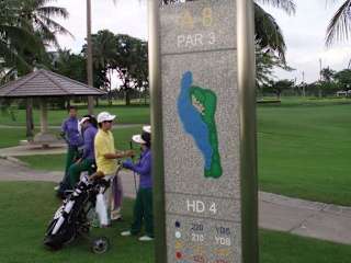 Golf at Panya Indra Es wird sicher nicht leicht sein, doch wenn sich die Möglichkeit für Sie ergibt, sollten Sie Panya Indra spielen. Ich dachte mir nichts böses, als ein guter Freund, der in Bangkok lebt, mich zu einer Runde einlud, die- wie er sagte: etwas anders sei… Panya Indra liegt ca. 30 min. außerhalb von Bangkok Richtung internationaler Flughafen. Misstrauisch wurde ich, als wir krampfhaft anfingen eine Driving Range noch vor unserer Tee- Off Zeit um 11: 45 zu finden. Die Range des Clubs öffnet offiziell erst am Abend!!! da es dann kühler ist. Als wir auf das Gelände des Clubs fuhren war mir alles klar. Hier spielten die Profis von Bangkok. Geschäftsleute, die ihre Partner extra aus Tokio, Singapur oder Hongkong einfliegen ließen, um sich hier mit Driver und Wedge zu duellieren. Unser Flight bestand aus zwei Asiaten, die “nur manchmal” spielten. Startzeiten gibt es von 06: 00 bis 10: 00 dann wurde nochmals gewässert und um 11: 00 ging es weiter. Aus den 3 mal 9 Bahnen wurden uns 2 zugeteilt und wir begaben uns an Tee 1. Dort warteten über 30 besessene mit ihren Candys ( ausschließlich Damen) auf ihren Abschlag. Jeder von ihnen schmetterte seinen Drive gute 200 Meter vom weißen Tee und ich überlegte, welche Art von Anfall ich jetzt noch auf die Schnelle vortäuschen könnte. Doch dann kommen die Momente in denen ich sicher bin, dass es doch einen Gott im Himmel geben muss. Nice shot murmelte die nicht kleiner werdende Horde von Golfern und ich voran bemühte mich mit meinem Flight dem Ball nach zu laufen. Der Platz selbst bietet allerlei Gemeinheiten, wie Wasser rechts des Fairways, Bunker- so tief wie Baugruben und gefüllt mit Treibsand, frech platziert in Landezonen. Die knapp 2 Kilo die ich auf der Runde irgendwo verloren habe, waren fast nur Flüssigkeit, doch dank zahlreicher Verpflegungshäuschen muss man keinen Sorge haben zu verdursten. Mein Fazit: Nach fast 5 Stunden Golfvergnügen und einigen versenkten Bällen kamen wir in einer wunderschönen Abendstimmung wieder am Clubhaus an und ich war mir nun sicher, dass hier die Quelle derer liegen muss, die Golf als Sport sehen. Meinen Score hab ich bis heute nicht ausgerechnet, aber beim Sport ist ja dabei sein alles…