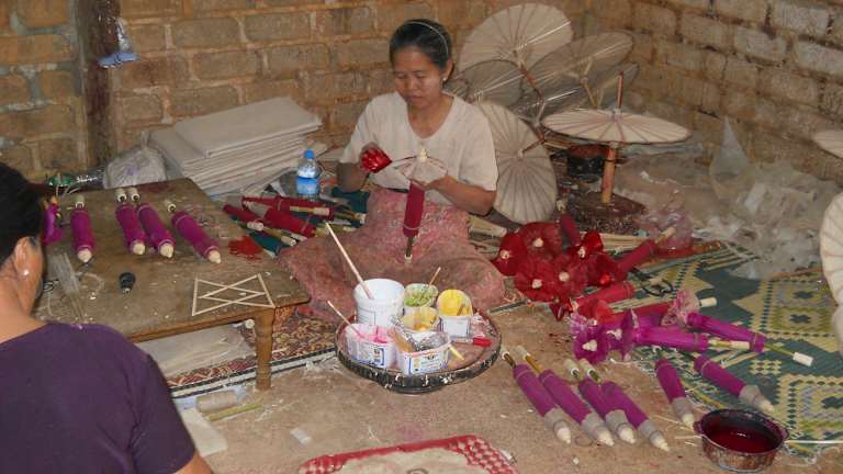 Auf dem Weg zu unserem Hotel hatten wir uns einen Familienhandwerksbetrieb angesehen. In diesem werden Papierarbeiten aus dem Maulbeerbaum hergestellt. Die Oma hatte auf großen Sieben das Papier geschöpft, kleine Blüten wurden in die nassen Fasern gelegt. Anschließend wird das Papier in der Sonne getrocknet. Mit einer alten Konstruktion drechselte ein Mann das Gestänge für die Sonnen- und Regenschirme und die Fächer. Von den Frauen wurde das Papier mit bunten Farben bemalt und auf das Gestänge geklebt. In einem Nebenraum wird dies alles zum Verkauf angeboten. Gerne kauften wir einen Sonnenschirm, Fächer und Geschenktüten.