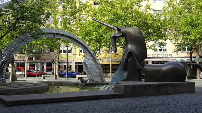 Der große Brunnen wurde 1995 vom Künstler-Ehepaar Rumpf entworfen. Hier findet man etliche Tierdarstellungen - unter anderem auch einen Drachen, der laut Plakette Trinkwasser speit (das Wasser im Brunnen ist kein Trinkwasser).