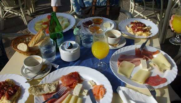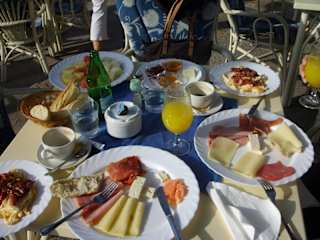 Wer in seinem Urlaub am Meer, statt auf dem Boulevard sitzen möchte, der ist in einem der leider wenigen Lokalitäten am Meer - nämlich im "Paradise" richtig aufgehoben. Hier kann man bequem und gemütlich unter schattigen Pinien sitzen und den Blick auf das Meer und die Bucht von Paguera genießen. Zum einen haben wir dort köstliche Tappas, zum anderen das Gourmet-Frühstück probiert, das ich nur jedem wärmstens empfehlen kann! Als wir unser 3-Sterne Frühstück "satt" waren gönnten wir uns hier ein Frühstück für 8, 95,- Euro was es in sich hat: frisch gepresster Orangensaft, frische Brötchen, Käse, Wurst, Schinken, Lachs, Honig, Marmelade, Rührei sowie ein großer Teller mit frischem Ost - köstlich! Wer morgens nicht so viel essen kann, dem reicht auch ein Frühstück für zwei Personen, da es wirklich reichlich ist!!