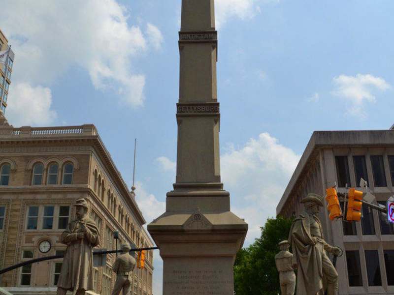 Während meines Besuchs der Innenstadt von Lancaster, Pennsylvania, bin ich am 21. Juni 2011 auch zum Penn Square gekommen, auf dem sich das Soldiers and Sailors Denkmal zu Ehren der gefallenen Soldaten aus Lancaster County befindet. Aufgrund seiner zentralen Lage und des gesamten Erscheinungsbildes kann ich den Penn Square wirklich nur empfehlen. Die Erreichbarkeit kann man aufgrund der zentralen Lage inmitten von Lancaster nur als "perfekt" bezeichnen. Wer sich innerhalb von Lancaster kann den Penn Square praktisch nicht verfehlen. Er bildet den gewundenen Kreuzungsbereich der beiden Hauptverkehrsstraßen King Streets und Queen Streets und ist aus allen Richtungen gleichermaßen gut zu erreichen. Zudem befinden sich der Central Market und das Marriott Hotel direkt am Penn Square und prägen die umgebende Architektur. Autofahrer können den Penn Square ebenfalls nicht verfehlen. Über den US-Highway 222 aus Süden und Norden gelangt man ebenso zum Penn Square wie über den Pennsylvania-Highway PA-462 aus Westen oder den US-Highway US-30 von Osten her kommend, der seinerseits unmittelbar auf den PA-462 führt. Aufgrund der Einbahnstraßenregelungen ist es von Norden du Osten her kommend unumgänglich, sich einen Parkplatz in einer der Parallelstraßen zu suchen. Von Norden her kommend empfehle ich den Bereich entlang der Prince Streets zwischen der West Orange Street und der West King Street, von Osten her kommend entlang der East Orange Street zwischen North Lime Street und North Queen Street. Entlang der Hauptverkehrsstraßen ist das Parken nur gegen Gebühr möglich, ist im Vergleich zu deutschen Parkgebühren jedoch sehr preiswert (ein Quarter pro Viertelstunde). Aufgrund seiner zentralen Lage und seines gesamten Erscheinungsbildes ist der Penn Square meiner Meinung nach wirklich ein Platz, den man in Lancaster gesehen haben sollte. Er liegt wirklich inmitten des Herzens der Bezirkshauptstadt und bietet eine Menge fürs Auge. Der Kreuzungsbereich besteht wegen der Einbahnstraßenregelungen nahezu aus einer stilisierten acht, wodurch sich großflächige Verkehrsinseln gebildet haben. Diese erleichtern das Überqueren der Verkehrsadern und bieten dem Besucher unvergessliche Rundumblicke. Die Optik wird hier nämlich primär von den umgebenden Gebäuden geprägt, die einfach nur schön anzusehen sind. Da wäre beispielsweise das Lancaster Marriott in der südöstlichen Ecke des Lancaster Squares, aber auch der Lancaster Central Market in der nordwestlichen Ecke sieht einfach nur toll aus und fügt sich sehr schön an den Square an. Der rote Bodenbelag des Penn Squares passt sehr gut zur roten Ziegelwand des Markts und hebt sich optisch damit sehr schön von der hellen Fassade des Marriott Hotels ab. Sehr schön sind zudem die alte Standuhr im Nordwesten des Squares in unmittelbarer Nähe zum Central Market sowie das Herzstück des Penn Squares, das Soldiers and Sailors Memorial. Sitzbänke aus dunklem Marmor bieten Möglichkeiten, sich auszuruhen und das Treiben rund um den Platz sowie den Anblick des Hotels und das Monuments zu genießen. Die Budgetfreundlichkeit ist perfekt, da ein Besuch des Penn Squares mit keinerlei Kosten verbunden ist. Lediglich als Autofahrer hat man aufgrund der Parkgebühren entlang der Hauptstraßen mit Kosten zu rechnen, die man durch umsichtiges Parken in den kleineren Nebenstraßen jedoch zum Teil umgehen kann. Insgesamt befindet sich der Penn Square mit seinem Soldiers and Sailors Monument in einem sehr guten Zustand. Lediglich der erhebliche Autoverkehr an diesem Knotenpunkt mindert das Gesamterscheinungsbild ein bisschen. Die historischen Gebäude rund um den Square sind sehr gut gepflegt und sehr schön anzusehen. Historisch ist der Penn Square in zweiter Instanz von großer Bedeutung für Lancaster und Lancaster County. Als Verkehrsknotenpunkt von Lancaster ist der Platz selbst von Bedeutung, sehr viel wichtiger ist hingegen der Hintergrund für die Errichtung des Soldiers and Sailors Monuments. Dieses 13 Meter hohe neugotische Denkmal wurde 1874 einst zu Ehren der Soldaten der Unionsarmee errichtet, die während des Sezessionskrieges von 1861 bis 1865 gekämpft haben. Im Laufe der Zeit wurde das Monument mehr und mehr erweitert und dient heute als Mahnmal zu Ehren aller gefallenen Soldaten von Lancaster während der Kriege seit dem Sezessionskrieg. Seit dem 2. April 1973 steht das Soldiers and Sailors Monument im amerikanischen Nationalregister historischer Plätze. Auf den Penn Square bin ich erst während meines Aufenthaltes in Lancaster aufmerksam geworden. Ich hatte meinen Wagen in der East King Street geparkt und bin im Vorfeld über den Penn Square in die Stadt hinein gekommen. Die Lage, die Umgebung und natürlich das Monument hatten mich vom ersten Moment an begeistert.