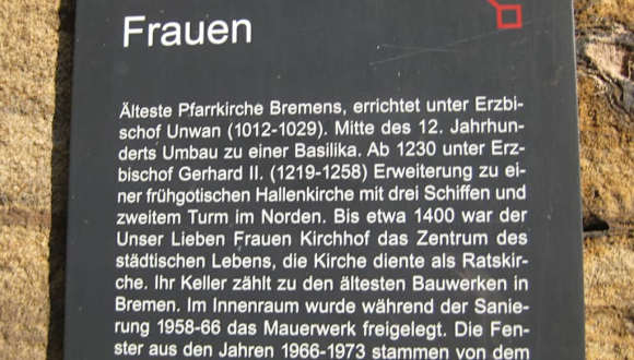 Seit dem 11. Jahrhundert steht die Kirche Unser Lieben Frauen mitten in der Bremer Altstadt. Bis zum 19. Jahrhundert war sie daher auch offizielle Ratskirche. Die Vorderfront der Kirche ziert ein Reiterstandbild, das den deutschen Generalfeldmarschall Helmuth von Moltke (1800-1891) darstellt. Im Inneren ist das "Pfingstfenster" sehr interessant. Es stellt die Ausgießung des Geistes Gottes dar und geht zurück auf die Apostelgeschichte 2.