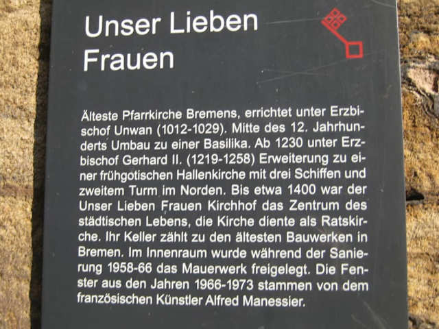 Die Kirche steht zentral am Bremer Marktplatz, direkt neben dem Bremer Rathaus und dem Dom. Sie ist etwa 60 Meter lang und etwa 35 Meter breit mit zwei Türmen, einem kleinen (etwa 30 Meter hoch) und mit etwa 80 Metern einem deutlich höheren . Der erste Vorgängerbau wurde 1020 aus Holz gebaut. Etwa Mitte des 12. Jahrhunderts wurde ein neuer Steinbau errichtet, von dem noch der Beinkeller und der alte kleinere romanische Südturm erhalten sind. Weil die Bevölkerung schnell wuchs, wurde diese Kirche auch bald zu klein, sodass ab 1229 die heutige frühgotische Hallenkirche mit drei Schiffen gebaut wurde. Mit dem Dom gehört diese Kirche zu den ältesten der Stadt Bremen. Bis zum Bildersturm Ende des 16. Jahrhundert war die Kirche reich ausgestattet. Die geschnitzte Predigtkanzel stammt aus der Zeit Anfang 18. Jahrhundert. Weitere Anbauten und Umbauten veränderten im Laufe der Zeit das Innere und Äußere der Kirche. Im 2.Weltkrieg wurde die Kirche schwer beschädigt und nach dem Krieg wieder aufgebaut. Unser Lieben Frauen diente auch als Rats- und Marktkirche, noch bis 1910 wurden hier alle Dokumente des Rates in der so genannten Tresekammer im Nordturm aufbewahrt. Interessant ist die Tatsache, dass das Geläut der Kirche nur aus einer Glocke aus dem 13./14. Jh. besteht, die im rechten Turm hängt. Daneben gibt es nur noch die Uhrglocke. Heute sind die farbenprächtigen Glasfenster des französischen Malers Alfred Manessier der besondere Anziehungspunkt für Besucher, auch mich haben sie sehr beeindruckt. Als ich durch das Hauptportal die Kirche betrat, fiel mein Blick durch das Mittelschiff sofort auf das leuchtende große Pfingstfenster. Auch das Weihnachtsfenster und das Predigtfenster sind beeindruckend. Man sollte sich unbedingt die Zeit und Ruhe nehmen, diese Fenster genau zu betrachten. Besonders bei Sonnenschein entwickeln sie eine Strahlkraft, die der Kirche eine besondere Atmosphäre verleiht.