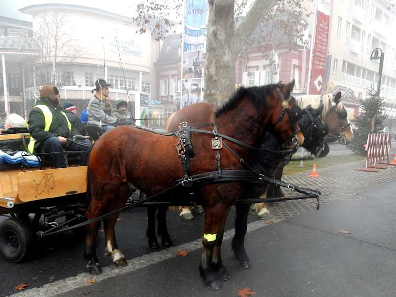 Am 2. und 4. Adventsonntag kann man eine Pferdekutschenfahrt unternehmen, Start gegenüber vom Hotel Allmer. Wir kauften uns am letzten Adventsonntag eine Karte in der Bastelstube für € 3,-- pro Person und Fahrt. Wie gesagt das Wetter war nicht berauschend (es war neblig und trüb), aber wir ließen uns die Stimmung nicht vermiesen.... Gut in Decken eingepackt ging es los, eine Runde (Dauer ca. 15 Minuten) auch durch den Kurpark und wieder zurück. Finde ich eine gute Idee, riesen Spaß für Groß und Klein.....