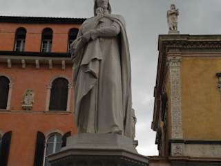 Mit schönen Palästen hatten die Scaliger den Platz der Herren ( Machthaber) umbaut. Auf dem großen Platz steht der überlebensgroße Dichter und Denker DANTE. Man geht von der Piazza delle Erbe durch den Palazzi dei Giudici , Justizpalast, in welchem die Richter aus Venedig Recht sprachen zu ihrer Zeit. Rechts davon steht der Palazzo del Comune von 1194, sowie der Torre dei Lamberti von 1365. Auf der Gegenseite steht der Palazzo del Governo, man erkent ihn an seinem Zinnenkranz. Direkt neben diesen dunkleren Gebäuden, bauten die neuen Herren aus Venedig die sehr gefällige Loggia Fra Giocondo, mit den bunten Verzierungen zwischen den Fenstern.