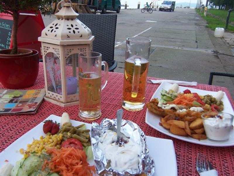 Haben Seelachs "frisch im Backteich" bestellt. Es war mehr Backteich als Fisch, von frisch zubereitet ganz zu schweigen, da er kalt war. Der Salat schwamm im Dressing auf dem Teller, dadurch wurden die Fritten, die zur Hälfte eh nicht gar waren , noch matschiger. Das ganze für €9,50 - eine absolute Frechheit. Hier fühle ich mich als Tourist ausgenommen.