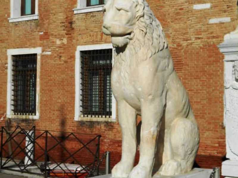 Die etwa drei Meter große Statue eines sitzenden Löwen vor dem Eingang zum Arsenale zeigt schon auf den ersten Blick keine Ähnlichkeit mit dem geflügelten venezianischen Löwen, der über dem Eingang in die Fassade eingelassen ist. Die Statue, vermutlich im 4. Jahrhundert geschaffen, stand ursprünglich im Hafen von Piräus, von wo sie 1688 nach Venedig gebracht wurde, nachdem venezianische Truppen zusammen mit einer Söldnertruppe die Osmanen besiegt hatten. Seither hat der Löwe seinen Platz vor dem Portal „Ingresso di terra“ des Arsenale.