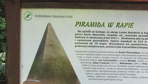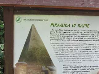 Ca. 27 km westlich von Goldap liegt das dorf Rapa/dt. Kleinangerapp. Die Anreise über Goldap führt über einsame und schöne Landstraßen sehr nah an der russischen Grenze entlang, Schilder + Grenze oft in Sichtweite. Auch das Dorf Rapa liegt nur 1,5 km von der russische Grenze entfernt. Man fährt von Goldap kommend die Kreuzung vor dem Dorf nach links und nach ca. 250 m auf den linksseitigen gebührenpflichtigen Parkplatz. Zur Pyramide geht man zurück auf die Straße und geht diese noch etwa 50 m weiter in Fahrtrichtung, dann tut sich links ein schnurgerader Fußweg durch den Wald auf, an dessen Ende man die Pyramide schon stehen sieht. Zunächst wirkt sie recht klein, aber je näher man ihr kommt, umso größer erscheint sie einem. Der Graf Fahrenheid aus Beynuhnen (ca. 5 km entfernt - liegt hinter der Grenze in Rußland) hat die Pyramide 1811 als Grabstätte bauen lassen, um seine mit nur 3 Jahren verstorbene Tochter Ninette beizusetzen. Später folgten weitere Familienangehörige. Das Grab wurde 2x von den Russen verwüstet und geplündert: 1914/15 und 1945. In diesem Zustand ist es auch noch heute. Die Polen habe notdürftige Sicherungsarbeiten ausgeführt. Der Eingang der Pyramide ist zugemauert. Die Särge sind noch in der Pyramide und zumindest wieder verschlossen. Durch die 3 vergitterten Fensteröffnungen kann man etwas ins Innere schauen, indem man sich auf die unter die Fensteröffnungen hingelegten Mauersteine stellt. Der Zustand der Grabstätte ist sehr traurig und man kann nur hoffen, dass die Polen, die ja über sehr gute Restaurateure mit Weltklasseniveau verfügen, eine Sanierung bald in Angriff nehmen würden. Ich empfand es als ein sehr beklemmendes Stück deutscher Geschichte dort. Mein Fazit war: sehenswert als Idee, eine Pyramide als Grabstätte zu errichten und für historisch Interessierte. Der Zustand der Pyramide ist jedoch recht sanierungsbedürftig. Am Parkplatz und im Dorf sind keine Gastronomie vorhanden, lediglich ein sehr kleiner Souvenirshop an der Parkplatzkasse.