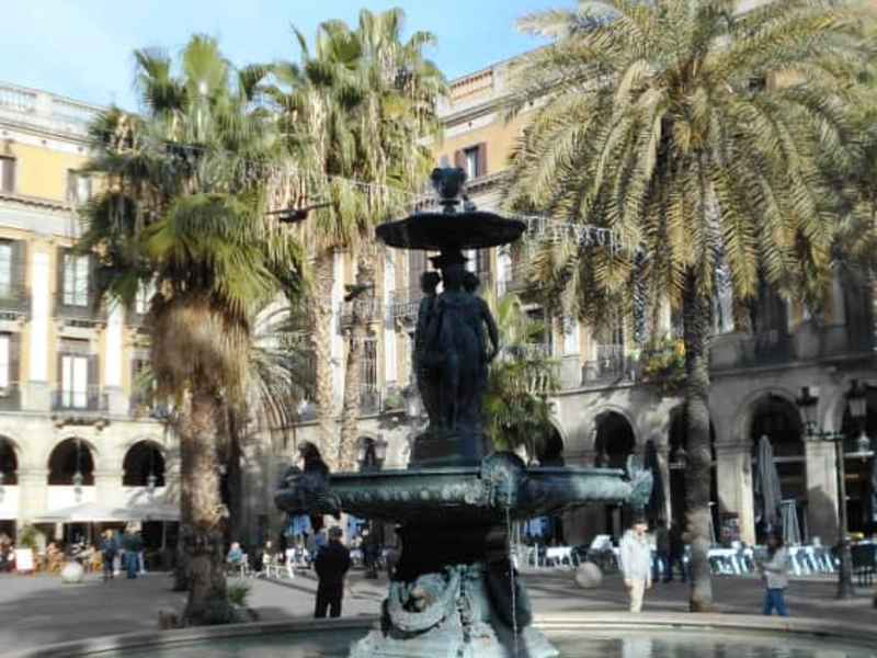 Der Plaça Reial befindet sich seitlich der Ramblas. Es ist ein schöner Platz mit Palmen, eine Springbrunnen und rundherum Arkaden mit Bars und Restaurants. Durch diese Geschlossenheit hat dieser Platz eine eigene interessante Atmosphäre, die zu verteilen bei einem Getränk einlädt.