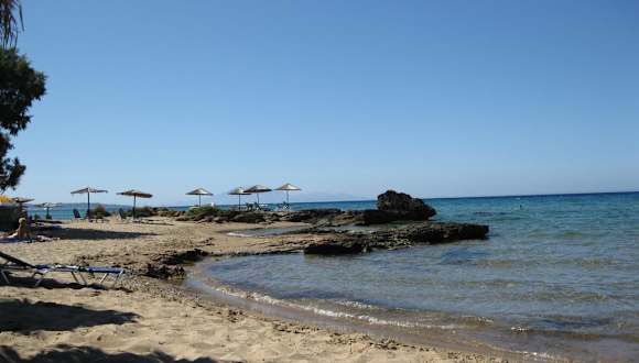 Es gibt in Griechenland KEINE Privatstrände !!! Jedermann/frau kann sich überall (!) am Sand hinlegen und geniessen. Das ist Gesetz! Richtig ist, dass der Strand sehr schön ist. Leider wird der Strand von einem Griechen bewirtschaftet (Liegen und Schirme) der von Gastlichkeit nichts hält. Sein Sohn (Typus Disco-Rausschmeisser) hat uns in äusserst agressiver Weise klar gemacht, dass hier nur (am Sand wohlgemerkt - wir wollten uns nur mal kurz im Meer erfrischen) liegen darf, wer seine Gebühren bezahlt. Wir wollten keine körperliche Auseinandersetzung riskieren und sind wieder gegangen. Wir haben dann auch von anderen gehört, dass solche Vorfälle an diesem Strand alltäglich sind. Also: Diese Vorgangsweise ist gesetzlich in ganz Griechenland verboten. Und solche "Gastgeber" sollte man nicht noch mit "Strandgebühren" belohnen! Das nächste mal würde ich den Vorfall bei der Polizei anzeigen. Trotzdem: Es gibt gott sei dank auch andere Griechen und der Strand ist wirklich sehr schön ...