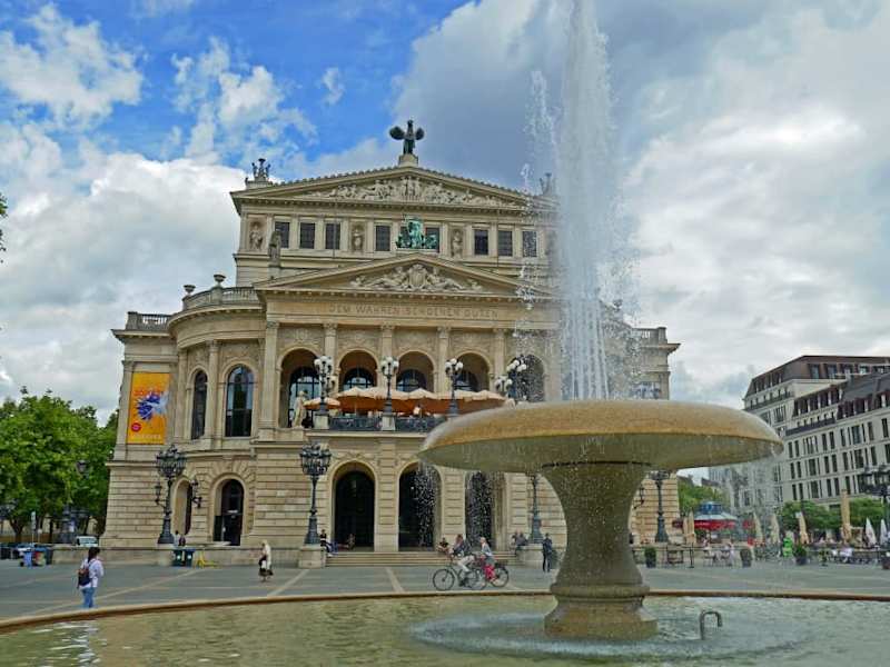 Der Opernplatz liegt vor der Alten Oper, zwischen der Taunusanlage und der Bockenheimer Anlage. Von dem Platz aus hat man einen tollen Blick auf die Alte Oper. Die Alte Oper wurde 1880 erbaut. Sie wurde im Zweiten Weltkrieg schwer beschädigt. Lange wurde mit dem Gedanken gspielt, dass man die Ruine abreist und einen modernen Verwaltungsbau dafür hierher stellt . Der ehemalige Bürgermeister Rudi Arndt („Dynamit-Rudi“) soll vorgeschlagen haben, die Ruinen „mit ein wenig Dynamit“ zu sprengen. Diverse Initiativen setzten sich aber für eine Renovierung der Alten Oper ein und sammelten mehrere Millionen Deutsch Mark für den Wiederaufbau. Schließlich hat sich auch die Stadt für den Neuaufbau entschieden und im Jahr 1981 erfolgte die Neueröffung als Konzert- und Veranstaltungshaus. Steht man auf dem Opernplatz, so steht man direkt vor der beeindruckenden Fassade der Alten Oper. Beispiele für diese sehenswerte Fassade sind: Ganz oben Pegasus, das geflügelte Pferd. Darunter, in dem Giebel, drei Grazien und Vertreter der Komödie und Tragödie. Links und rechts je eine Figurengruppe (rund um das Dach sind noch mehrere dieser Figurengruppen). Unter diesem Giebel sind 4 Frauen-Figuren und insgesamt 9 Fenster. Auf dem Dach des vorspringenden Giebels des Foyers befindet sich eine „Panther-Quadriga“. In dem Giebel unter der Panther-Quadriga das Stadtwappen, flankiert von zwei liegenden Männeren, die den Rhein und den Main darstellen. Am Ende dieses Giebels sind nochmals zwei Figuren, nochmals in Frauengestallt. Unter diesem Giebel steht der Schriftzug: „DEM WAHREN SCHOENEN GUTEN“. Diese Beschreibung der Alten Oper ist unvollständig (sowohl der Fassade als auch des ganzen Gebäudes). Es gibt noch mehr zu entdecken, schauen Sie sich einfach um.