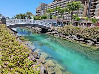 Das Wasser ist zwar im nahen Strandbereich (ca. 20m) türkisblau. Das ist dem aufgeschütteten hellen Sanduntergrund geschuldet. Aber im Wasser sieht man bereits in 1m Entfernung die Hand nicht mehr. Das verwundert auch nicht, denn die Molen, die die Bucht gegen die Wellen des Atlantiks schützen, haben den großen Nachteil, dass das Wasser kaum zirkulieren kann. In den Seitenbereichen des Strandes sieht man dann auch die entsprechenden Schaumkronen auf dem Wasser. Natürlich kann man ins Wasser gehen, und der geringe Wellengang hat auch seine Vorteile, nur: Wer kristallklares Wasser erwartet, wird enttäuscht. Ansonsten ist der Strand wirklich schön angelegt. Die Infrastruktur mit einer Promenade, Toiletten, Duschen, Geschäften, Bars, Restaurants und Boutiquen ist über die komplette Strandlänge ausgebaut. Dünen findet man deshalb hier nicht. Der Strand gehört zur Time-Sharing-Anlage Anfi del Mar, ist aber öffentlich zugänglich. Außerhalb der Anlage gibt es in den Seitenstraßen einige Parkmöglichkeiten. Entfernung zum Strand dann 100-200m. Oder man fährt in die Anlage in das kostenpflichtige Parkhaus. Wir haben für ca. 3h ca. 5€ bezahlt. Dann kommt man mit einem Lift direkt an den Strand. Wir waren an einem Sonntag dort. Da war der Strand praktisch voll.