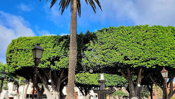 Schon im Jahr 1500 wurde für die Stadt San Cristobal de La Laguna ein Erlass gegeben, daß die vorhandenen Straßen so zu belassen sind, wie wir sie heute antreffen. Daß diese Stadt aber nicht mehr die Bedeutung hat wie vormals, kam daher, daß im Jahr 1648 der Stadt Orotava die Stadtrechte verliehen wurden. In La Laguna waren aber trotzdem noch die Cabildo, also die Inselverwaltung. Dadurch war der schöne Platz vor dem Rathaus immer auch der wichtigste Platz in der Stadt, auch weil dort die Residenz errichtet wurde. Auf dem Platz feierte man alle Feste, auch Stierkämpfe und auch der Vollzug der Strafen sind hier ausgetragen worden. Von Stierkämpfen kann man aber garnichts mehr sehen. Damals gab es auch hier schon einen Brunnen, dessen Wasser durch Holzrohre aus dem Mercedeswald hergeleitet wurde. Im Jahr 1843 wurde der Platz gepflastert, sowie mit Bäumen und Bänken aufgewertet. In der Mitte steht der Brunnen der 1870 aus Marmor hier aufgestellt wurde. Die herrlichen Bäume spenden Schatten , man kann sich gut ausruhen.