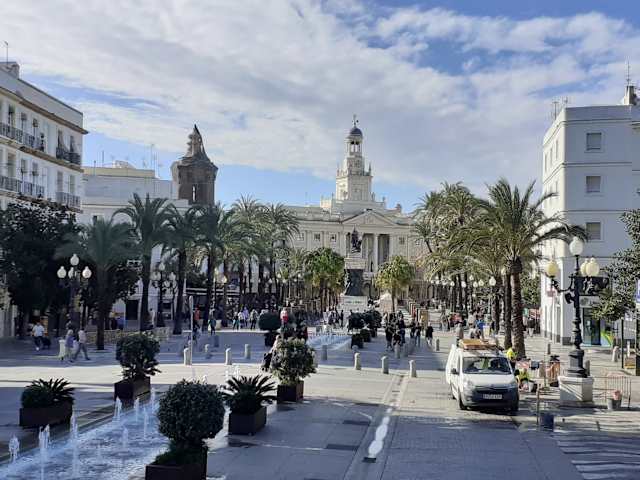 Der nach dem portugiesischen Heiligen Johannes von Gott benannte Platz vor dem Rathaus von Cadiz zählt wohl zu den schönsten Plätzen der Stadt. Zwischen dem Rathaus und der zum Hafen führenden Puerta del Mar Gaditana gibt es von Wasserspielen und Palmen gesäumte Alleen mit Straßencafés und dazwischen einige kleine Nebenstraßen mit weiteren Cafés, Bars und Restaurants.