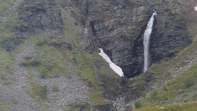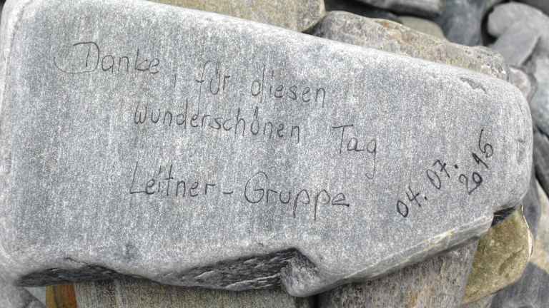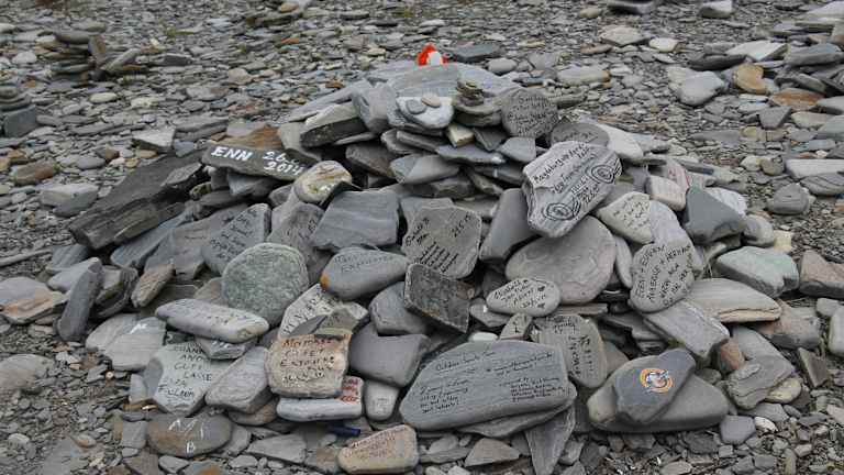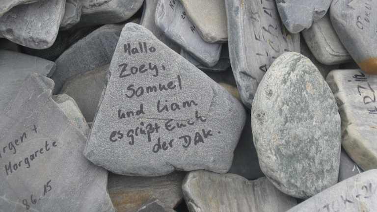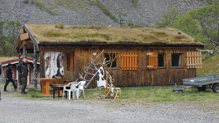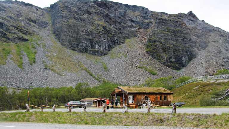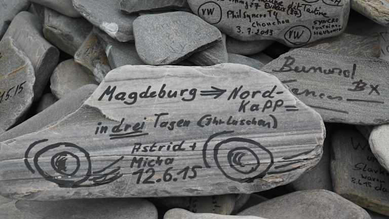Wir legten unsere Mittagspause in einer Bucht am Porsangerfjord in der Nähe der kleinen Ortschaft Lakselv ein. Der Porsangerfjord ist mit einer Länge von über 120 km und einer Breite von 10 - 20 km einer der größten Fjorde Norwegens. Seine Ufer sind kaum besiedelt. Lakselv ist das größte Dorf und Verwaltungszentrum der Gemeinde Porsanger. Das Dorf liegt am südlichen Ende des großen Porsangerfjord Die Europastraße E06 Autobahn führt durch das Dorf. Die Gegend um Lakselv ist bekannt für Lachs , Forelle , Saibling und Äsche. Dieser Rastplatz am Porsangerfjord ist vor allem bekannt durch seine aus Schiefersteinen aufgestellten Steinmännchen und den beschrifteten Steinen. Mit diesen Steinmännchen, verewigen sich angeblich die Reisenden mit dem Versprechen zukünftig wiederzukommen. Niemand zerstört mutwillig die aufgeschichteten Steinhaufen eines anderen. Bemerkenswert waren auch die Sprüche in verschiedenen Sprachen auf den Steinplatten. Andi und Paul schrieben auf eine Steinplatte: Andi und Paul auf den Weg nach Nepal 10.06.2015. Astrid und Micha schrieben folgendes: Magdeburg – Nordkapp – in drei Tagen ( Ihr Luschen ), Astrid + Micha 12.6. 2015. Auf einer anderen Steintafel war zu lesen: Eleni + Eugen, Anneros + Hermann waren auch mal hier 08.06. Auch unsere Reisegruppe hat sich am 04.07.2015 mit folgenden Text verewigt: Danke für diesen wunderschönen Tag. Leitner Gruppe. 04.07.2015 Oberhalb der Bucht standen zwei traditionelle Blockhäuser mit Grasdächern. Solche Grasdächer halten im Winter schön warm und im Sommer sind sie angenehm kühl. In einem der Blockhäuser befand sich ein Souvenirladen, indem man typische lappländische Souvenirs kaufen konnte, wie z.B. Rentiergeweihe. In der Bucht befanden sich auch ein Toilettenhäuschen und eine überdachtes Häuschen mit einer Wanderkarte. Das Gebiet vom Porsangerfjord ist durch seine arktische Wildnis sehr beliebt bei Wanderern. Optimistisch fanden wir einen Eiswagen am Rastplatz. Bei Nieselregen und etwa 10 Grad hatte kaum ein Reisender den Gedanken, sich ein Eis zu kaufen. Auf jeden Fall sollte man bei diesem landschaftlich wunderschönen Rastplatz eine kurze bzw. auch längere Pause einlegen.