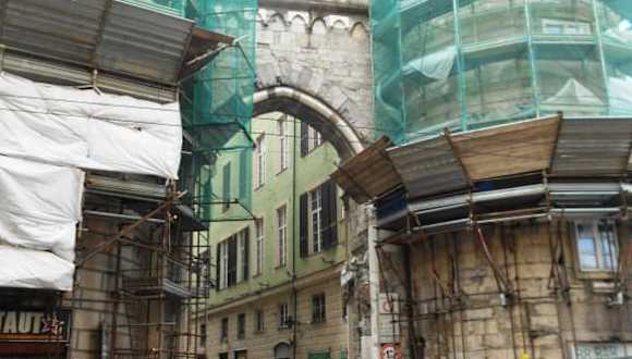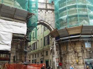 Die Porta dei Vacca – das Kuhtor – war Teil der genuesischen Befestigungsanlagen des zwölften Jahrhunderts. Die beiden halbkreisförmigen Türme wurden in spätere Bebauung integriert und zwischen ihnen verläuft heute die Via del Campo. In den 1960er Jahren wurden umfangreiche Restaurierungsmaßnahmen vorgenommen, bei denen einige der ursprünglichen architektonischen Merkmale wieder zum Vorschein kamen. Auch bei meinem Besuch im Mai 2022 waren wieder Renovierungs- und Restaurierungsarbeiten im Gange, so dass nur Bilder von den verhüllten Türmen aufgenommen werden konnten.