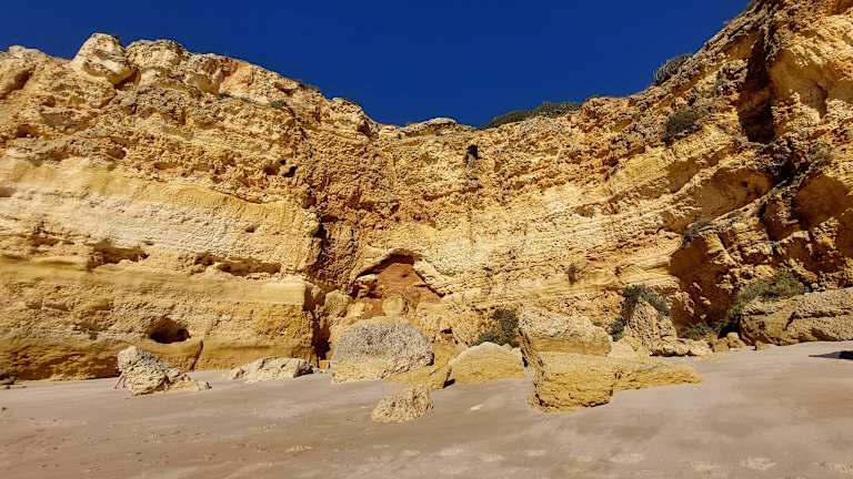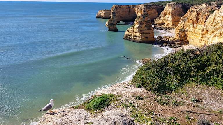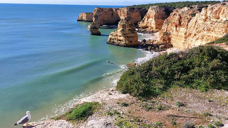 Der Strand „Praia de Marinha“ ist nicht umsonst in der Liste der 100 weltweit schönsten Strände weltweit vertreten. Für uns war er ein erholsamer Endpunkt nach einer 5 km langen Klippenwanderung entlang der Küste. Vom oberhalb des Strandes gelegenen Parkplatz führt ein gut ausgebauter Weg, teils über Treppen, hinunter. Am Parkplatz steht ein Foodtruck wo man sich mit kleinen Snacks und Getränken stärken kann, außerdem befinden sich dort Toiletten und Umkleidekabinen. Windgeschützt durch die umliegenden hohen Klippen ist es auch im Winter möglich zum baden und sonnenbaden. Im Januar ist der Strand fast menschenleer. Ein nicht mehr so geheimer Geheimtipp ist der kleine Strand „Praia do Buraco“ der direkt nebenan liegt. Gekennzeichnet durch ein in den Fels gehauenes Loch erreicht man diesen nur auf Knien krabbelnd durch kleine Löcher im Felsen, was durchaus eine Herausforderung besonders bei größeren Menschen sein kann. Belohnt wird man dafür um so mehr. Der Zugang ist nur bei Ebbe möglich.