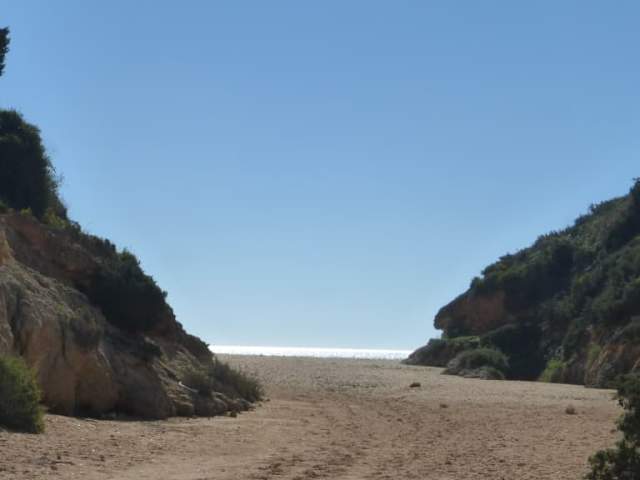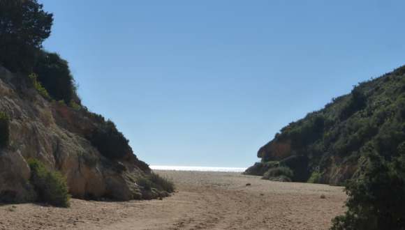 Die kleine Bucht, in der sich die Praia do Barranco befindet, ist ca. 400 bis 500 Meter von der Kapelle / Ermida da Nossa Senhora da Rocha entfernt. Wenn man vor der Kirche Richtung Atlantik blickt, so führt von der Kirche aus ein Weg nach rechts und man folgt diesem Wanderweg, der sich oberhalb des Meeres auf der Steilküste nach Westen windet. Über einen schmalen Pfad gelangt man später nach unten zum Strand. Als wir hier waren, konnte ich hier keine sanitären Anlagen und auch keinen Stand oder sonstiges für eine Strandaufsicht feststellen. Es waren auch keine Verkaufsmöglichkeiten sichtbar. Man sollte also seine Verpflegung selbst mitbringen – und natürlich Vorsicht walten lassen, da man im Atlantik immer mit gefährlichen Meeresströmungen rechnen muss. Dafür hat man einen Strand, der evtl. nicht so stark besucht ist, wie viele andere. Man muss jedoch damit rechnen, dass immer mal wieder Wanderer vorbei kommen, die jedoch meistens schnell wieder weiterziehen.