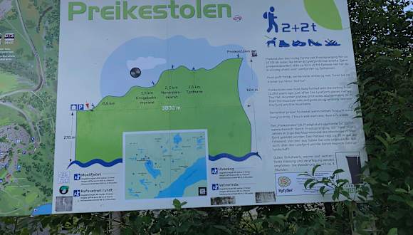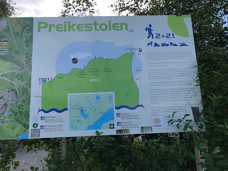 Aufstieg 2 km, dauert vom Parkplatz aus 2 Stunden, Abstieg ebenso lange. Der Wanderweg ist nicht mit denen im deutschen Mittelgebirge vergleichbar, es ist nämlich gar kein Weg. Man muss etwa die Hälfte der Strecke über eine Geröllhalde zurücklegen. Zwei steile Anstiege, bei denen die Höhe im Wesentlichen gemacht wird. Eine kleine Stelle, wo man schwindelfrei sein sollte, da etwa 2 m über eine 15 cm breite Kante balanciert werden muss. Oben ist natürlich kein Geländer, aber man muss ja nicht bis zur Kante gehen. Oben tolle Aussicht auf den Lysefjord, während der Wanderung aber keine Aussicht. Unbedingt hohe Wanderstiefel verwenden, da erhebliche Umknickgefahr. Bei nassen Steinen Abrutschgefahr. Walkingsticks sind nützlich. Bei erheblichen Verletzungen erfolgt der Abtransport per Hubschrauber. Auslandskrankenversicherung sollte man da haben.