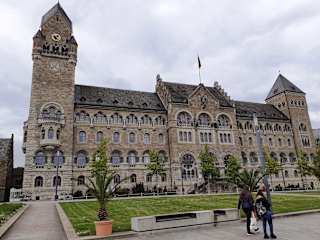 Von weitem (ich kam vom Kurfürstlichen Schloss) hielt ich den beeindruckenden Bau für eine Kirche. Bei näherer Betrachtung konnte ich ihn dann gar nicht mehr zuordnen, da offensichtlich ein kleineres Schloss (?) dazu gehörte. Letztendlich habe ich aber die Infotafeln gefunden: Es handelte sich um das ehemalige Preußische Regierungsgebäude und die Dienstvilla des Regierungspräsidenten. Letztere ist – für eine Dienstvilla – nun wirklich beeindruckend. Errichtet wurden die Gebäude zu Beginn des 20. Jahrhunderts. Anmerkung: Nicht weit vom ehemaligen Regierungsgebäude trifft man am Rheinufer auf das blau-weiße ehemalige Pegelhäuschen – hübsch anzusehen. Heute befindet sich dort ein Restaurant. Weiterhin sieht man – auf der dem Rhein abgewandten Seite der Dienstvilla – den großen altrosa Gebäudekomplex der „Struktur- und Genehmigungsdirektion Nord“. Dieses Gebäude wurde lt. Infotafel vor Ort kurz nach dem Preußischen Regierungsgebäude errichtet, nämlich 1907-10.