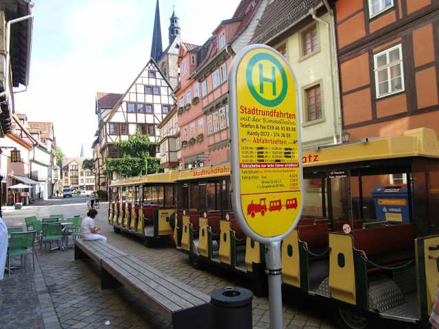 Die Quedlinburger Bimmelbahn ist eine gute Möglichkeit sich einen Überblick über die Stadt zu verschaffen. Die Rundfahrten kosten 6€ und starten um 10Uhr. Eine Runde dauert jeweils ca. eine Stunde und die letzte Fahrt findet um 16Uhr statt. Vom Fahrer erhält man nützliche Informationen zur Stadt und der Geschichte. Da es in der Altstadt sehr viel Kopfsteinpflaster gibt kann die Fahrt in den Wagen sehr holprig werden. Personen mit Rücken- oder Bandscheibenbeschwerden rate ich von der Fahrt ab.