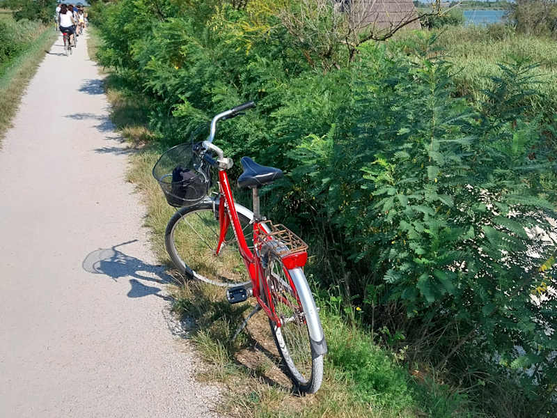 In und um Caorle herum kann man wunderbar Rad fahren. Es gibt in der Information eine kleine Mappe mit sechs oder sieben Radtouren. Nicht zu lang und nicht zu anspruchsvoll. Teilweise muß man über die Hauptstraße radeln, aber großteils über Landsstraßen und Schotterwege. Z. B. führt eine Tour auf einer Dammkrone entlang der alten Fischerhäuser von Caorle.